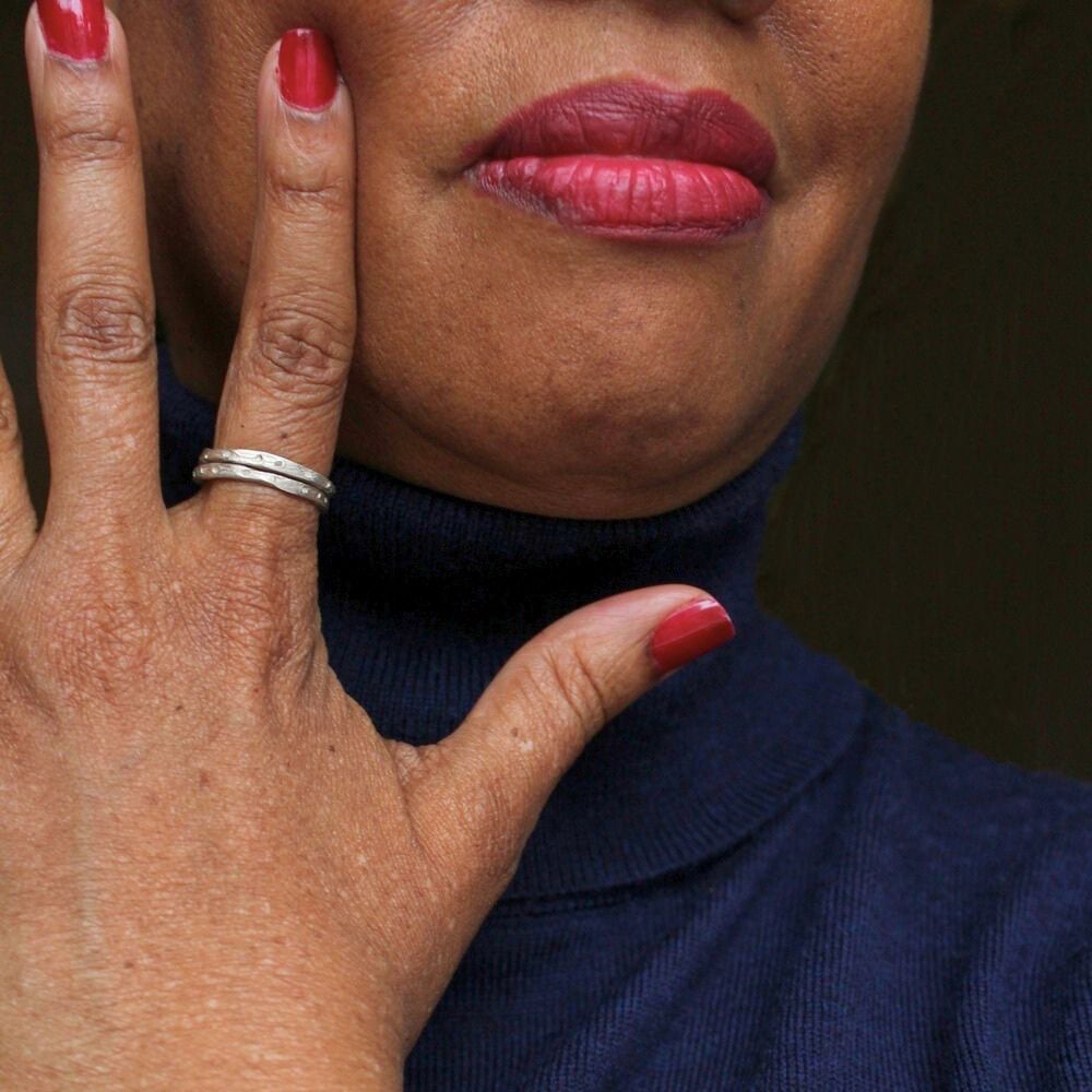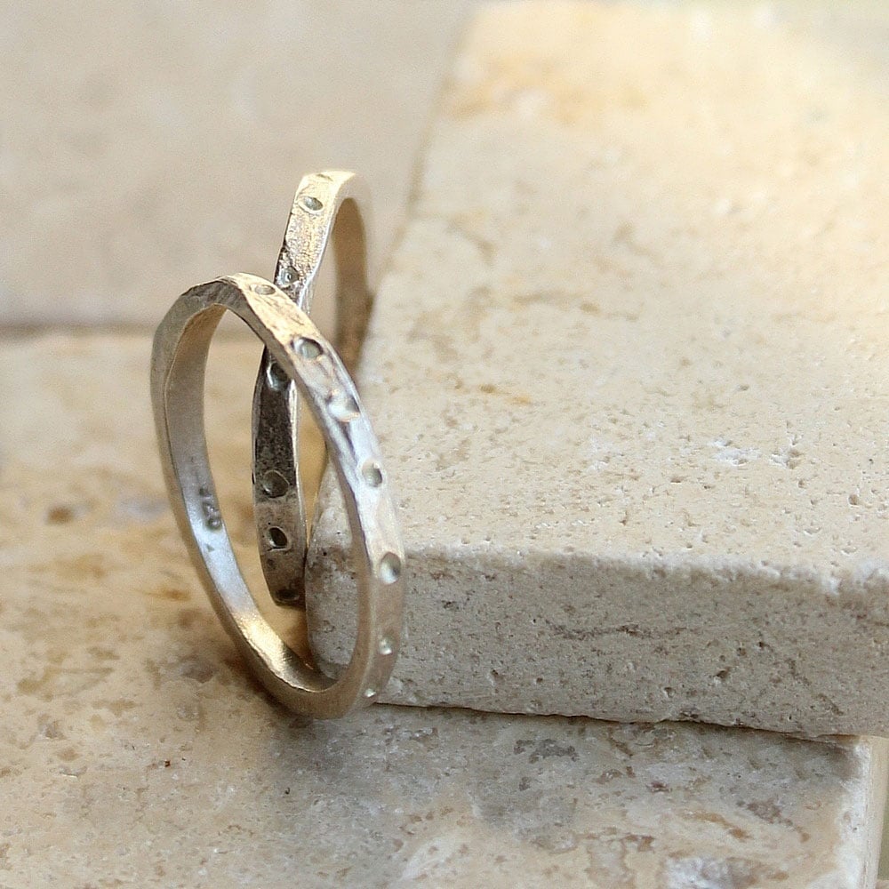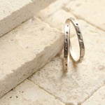 Sterling silver rings crafted with a light texture that is mimicked on both pieces. What began as a whole was divided in two. If you've ever seen identical twins, there is often a subtle difference between. A uniqueness that blends seamlessly whenever seen, or in this case worn together! This design is light and feels weightless on your finger. The rings sit close to the finger, easy to forget you have them on.