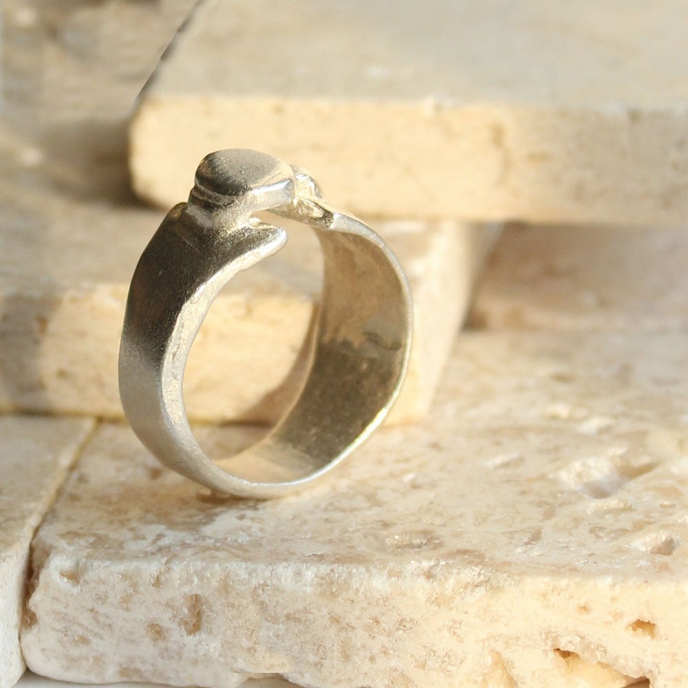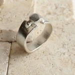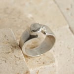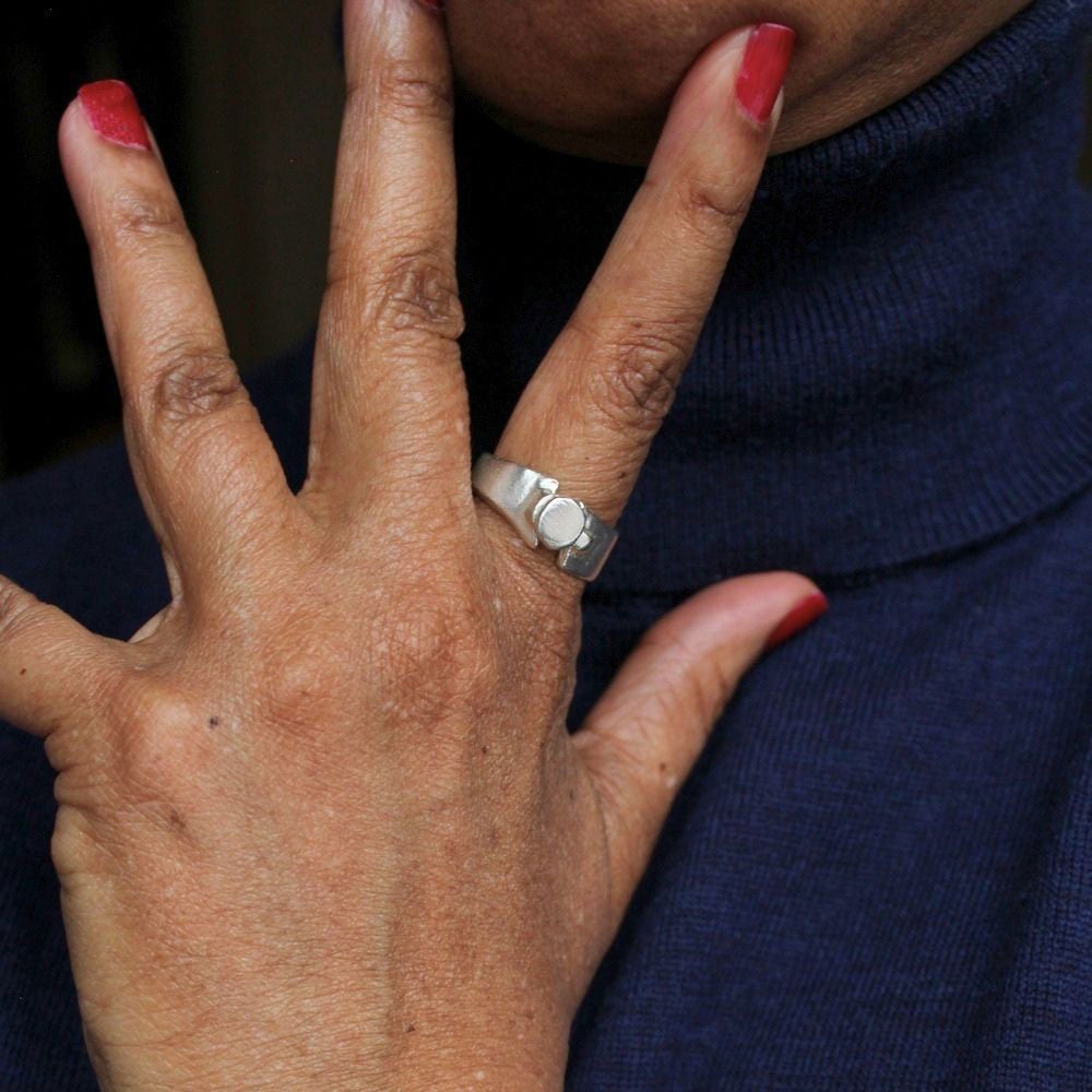 The surface is smooth with a subtle shine. The absence of texture gives the design a soft presence that continues thru the variation in the width of the band. A circular element at the top brings the form together. The ring feels balanced and calm, resting comfortably on the finger.