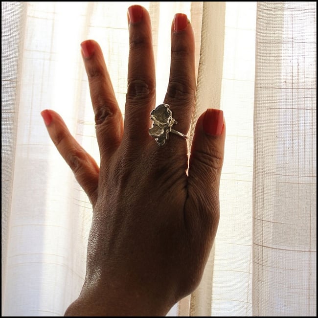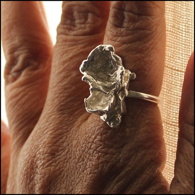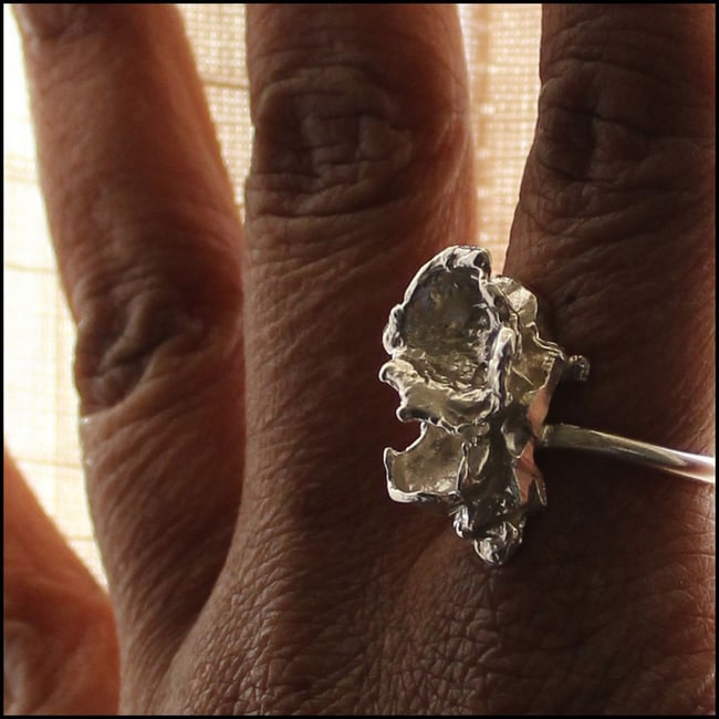 This sterling silver ring is a water cast design. The shape of the design and the texture of the piece gives elevated wabi sabi vibes. Add an organic silver accent to your day or night ensemble. Send me message if you're looking for a different ring size.