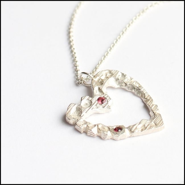 Between the two gemstones and the texture, this heart has a sparkle to it. It falls a little askew from it's chain. A reflection of real life in that a heart that has lived has "battlescars" and a capacity to love. This design is an endearing symbol that is relevant over a lifetime.**Currently this design is made to order/2 week turnaround.